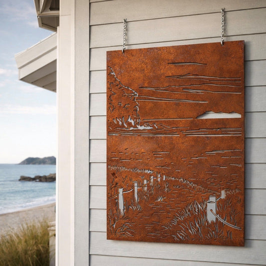 Corten steel wall hanging inspired by Waihi Beach with coastal design, natural rust patina finish,...
