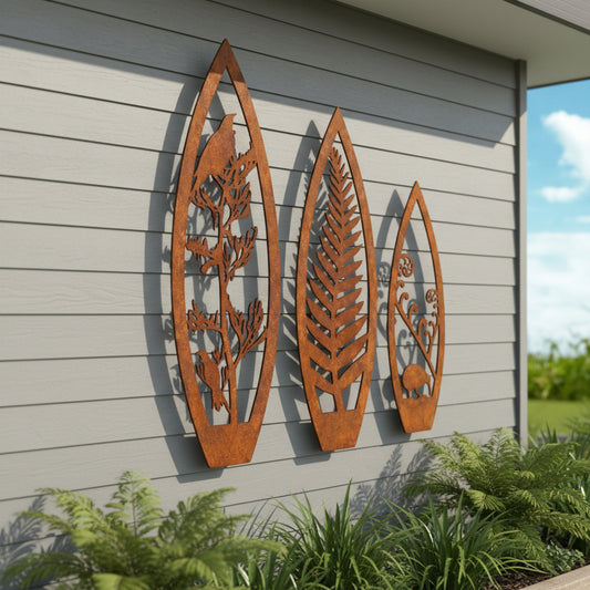 Custom Corten Trio Surfboard Set Intertwining a love for surfing, native birds (the Tui &...