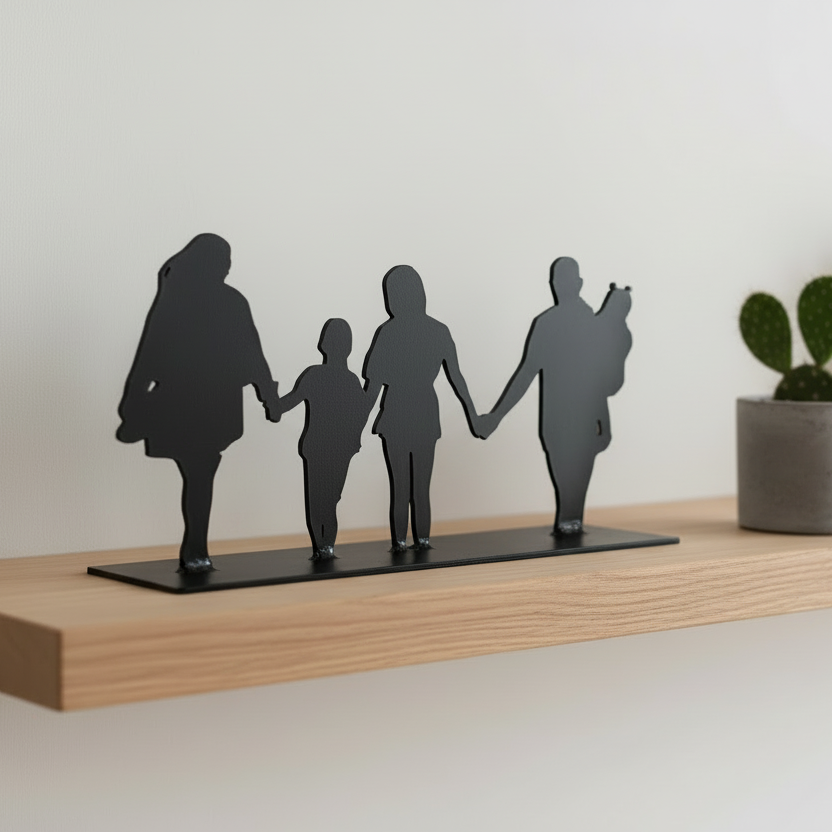 Turn a treasured moment into lasting art with our custom family photo silhouette cut-outs. Precision-cut from steel and welded to a sturdy base plate, each piece stands upright as a timeless sculptural keepsake. Designed from your photo and crafted to weather beautifully outside, or painted to find it's place indoors.