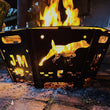 Portable octagonal fire pit that packs down flat for easy storage and transport. Add our custom made optional bag for clean transport and storage. Features a cooking top for outdoor meals.